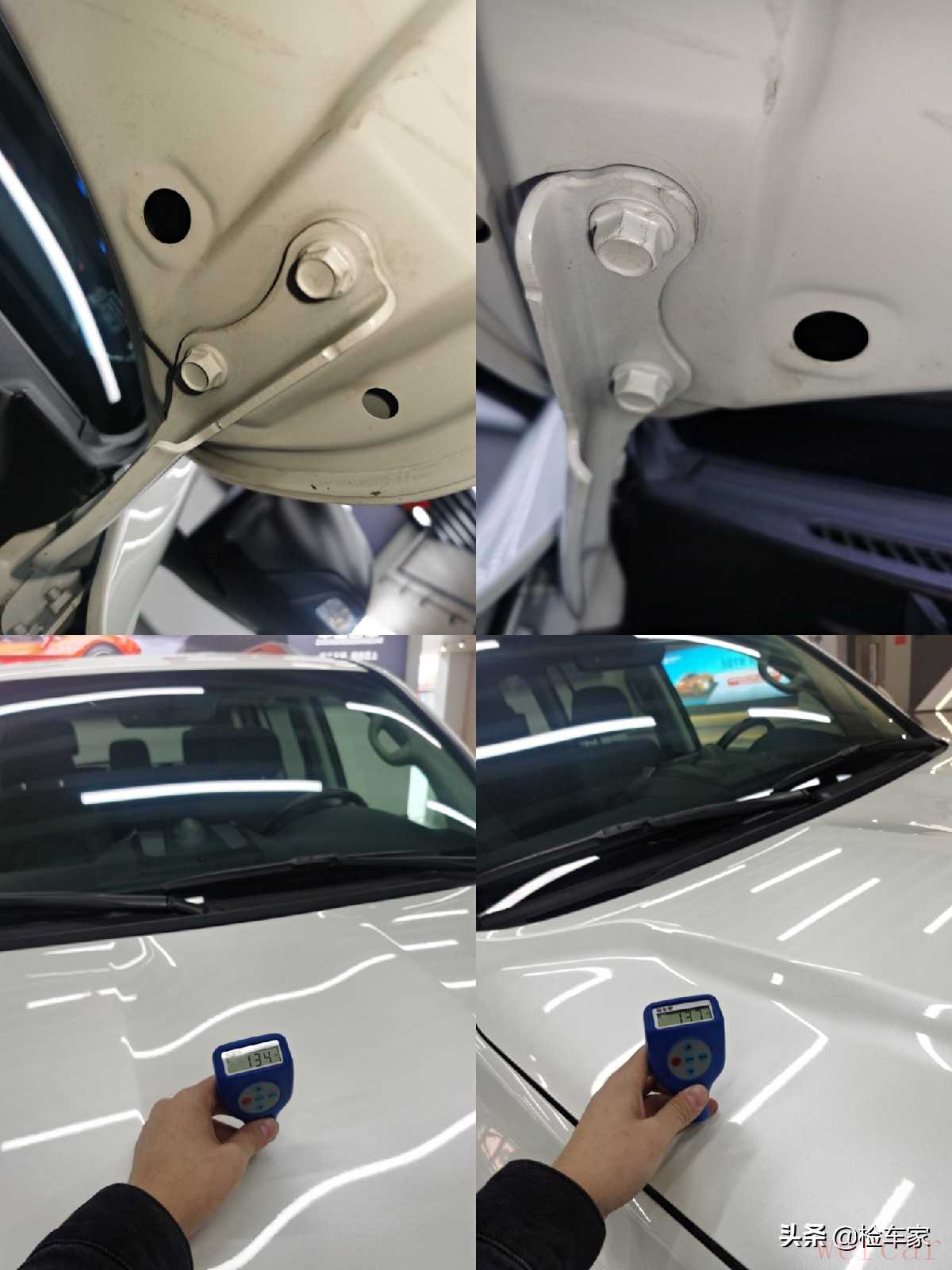 前机盖的铰链螺丝没有拆卸痕迹,用漆膜仪测出前机盖数值评论,且观察漆面也没有发现漆面瑕疵什么的。机盖边缘的胶线质地软硬适中而且没有中断的情况。种种检测结果检测下来,都印证了这是一个原厂的机盖,同时也更加说明了前面发生事故的可能性很小。而且测出来的漆面数值也可以作为这台车的一个参考数值。