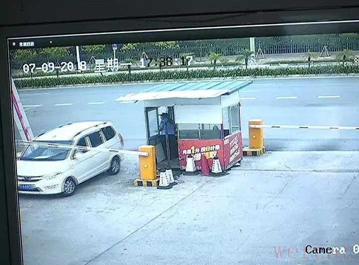 监控画面显示,7月9日17点38分左右,一辆五菱面包车打着右转向灯,从吉兴西路准备拐弯进入广隆二手车市场。此时,岗亭的保安已经伸出手递停车牌。不过,面包车转弯后,并没有停下来,而是直接冲开放行杆后,突然加速向前,像“疯牛”一样,接连几次撞向旁边的车辆,直到十几秒钟,才被逼停了下来。