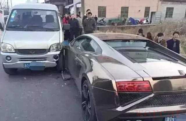 兰博基尼撞上了五菱,前者左前脸受损严重,车灯以及前保险杠损毁严重,五菱看上去则没什么大事儿…
