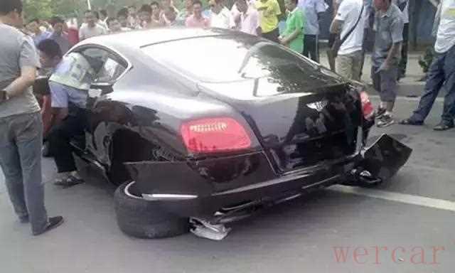 在某十字路口五菱和宾利发生严重交通事故,五菱一方前脸受损,而大宾利整个后轴完全被撞断,其中一个轮子还不知道飞到哪里去了…