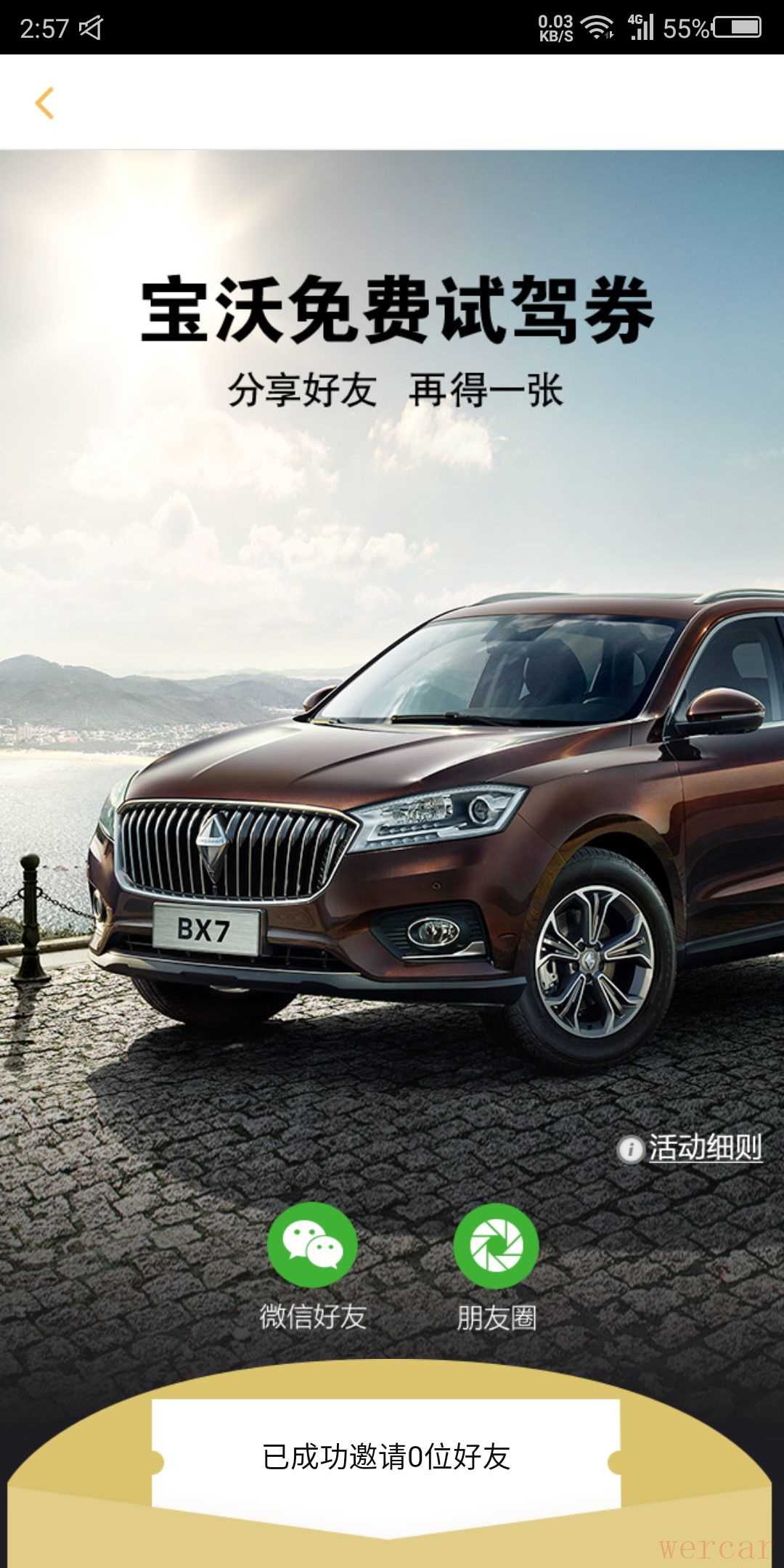 券用完了没体验够怎么办?简单!分享活动链接,好友试驾宝沃汽车,双方均可再次获得“免费试驾”体验券。推荐人可获得2小时+10公里内免费试驾券,被推荐人则可领取1小时+20公里免费试驾券,好东西当然是大家一起分享啦……