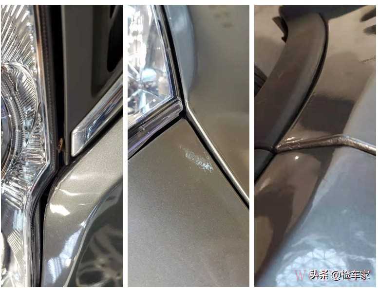 前两边翼子板,右边有腻子修复,左边翼子板可能变形比较严重,所以有过拆卸修复。两边翼子板骨架没有变形没有重新打胶痕迹,排除事故撞击的可能性。
