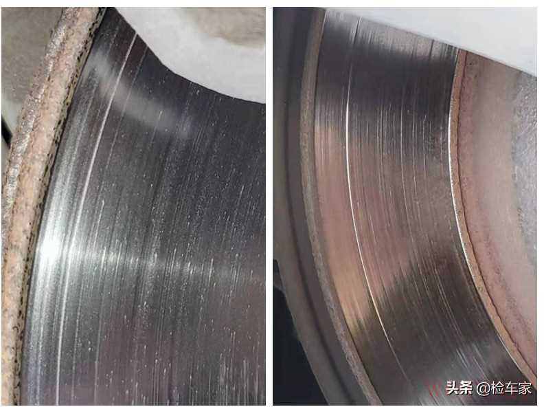 前后四个刹车盘磨损痕迹也是很明显的,而且踩刹车有异响, 这也是一个需要整备的点。