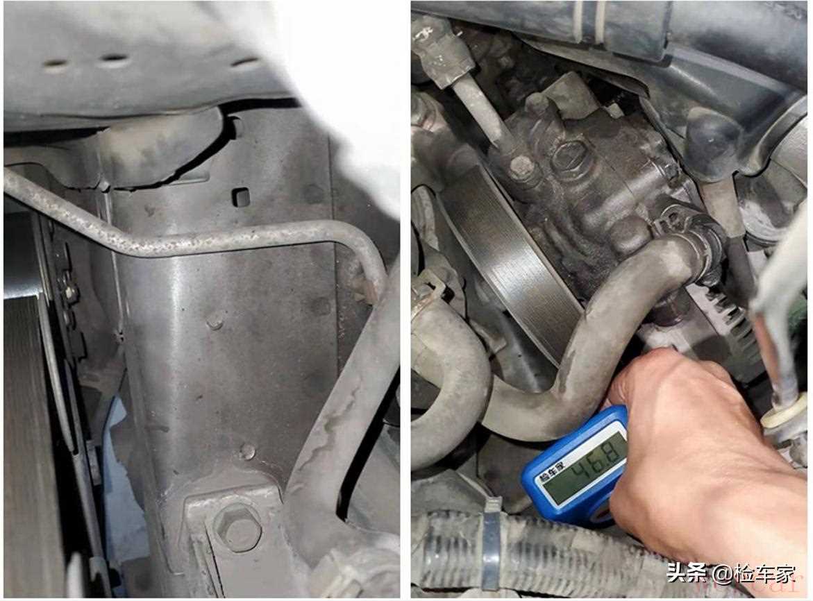 另外正前部的防撞梁有过更换,但撞击没有再延续到后面,冷凝器,水箱电子风扇都没有更换。我们看到前纵梁漆面数值正常,没有撞击修复,切割更换的痕迹。