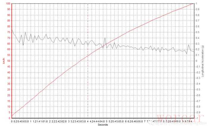 把挡位调至S挡,采用弹射方式起步,在刚起步阶段动力能感觉到一定的推背感,但是很快就衰退下来,并且加速度稳定0.4G左右,随后继续安稳下降。由于CVT变速箱的特性整个加速过程是很平顺的,在50km/h以下加速时也能给到一些主观上的加速爆发感,但由于四驱系统的加入导致后续加速比想象中慢,最终加速成绩为9.54秒。(作为参考,CR-V1.5T两驱车型加速成绩在8秒左右)。