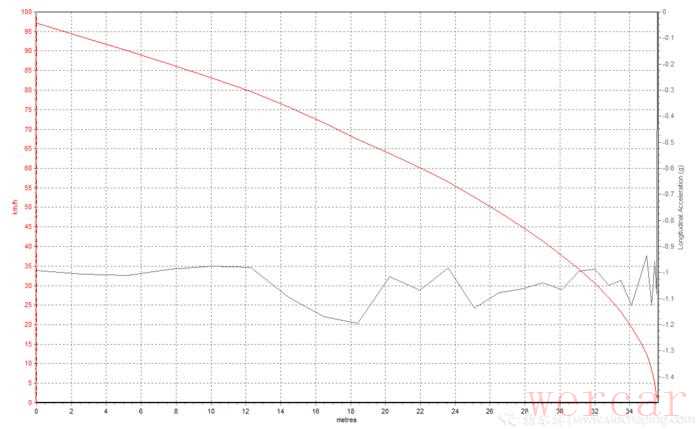 在全力踩下刹车时“点头”现象不算大,在SUV里头这是一个不错的车身姿态了,而且在整个制动过程中车身也没多余的动作,给予驾驶员一种很稳定的感觉。另外,整个制动过程中的制动力比较平均,并且大部分时间都能保持在-1G左右,最终百公里刹车成绩为37.87米。