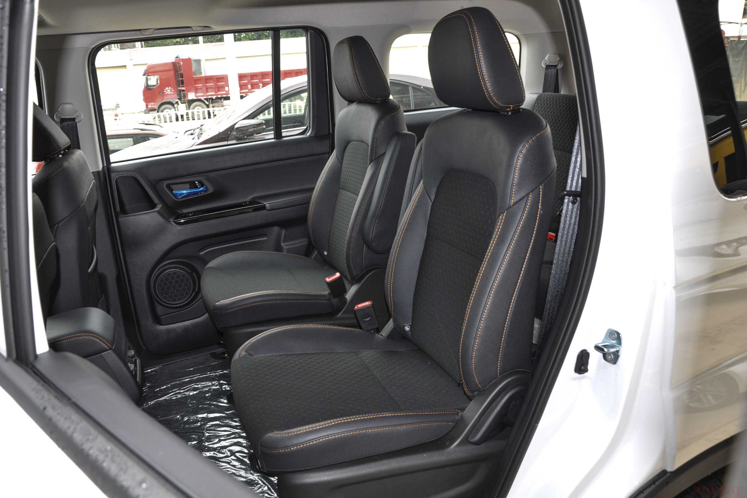 这款车车身参数是4620mm/1770mm/1820mm,轴距2750mm;设置了七个座位。小编身高170cm,坐进第二排,头部空间还有一拳两指,腿部也有一拳的空间。由于外观平正的原因,第二第三排空间相差无几,而且后排支持整体放倒,空间利用率还是很大的。