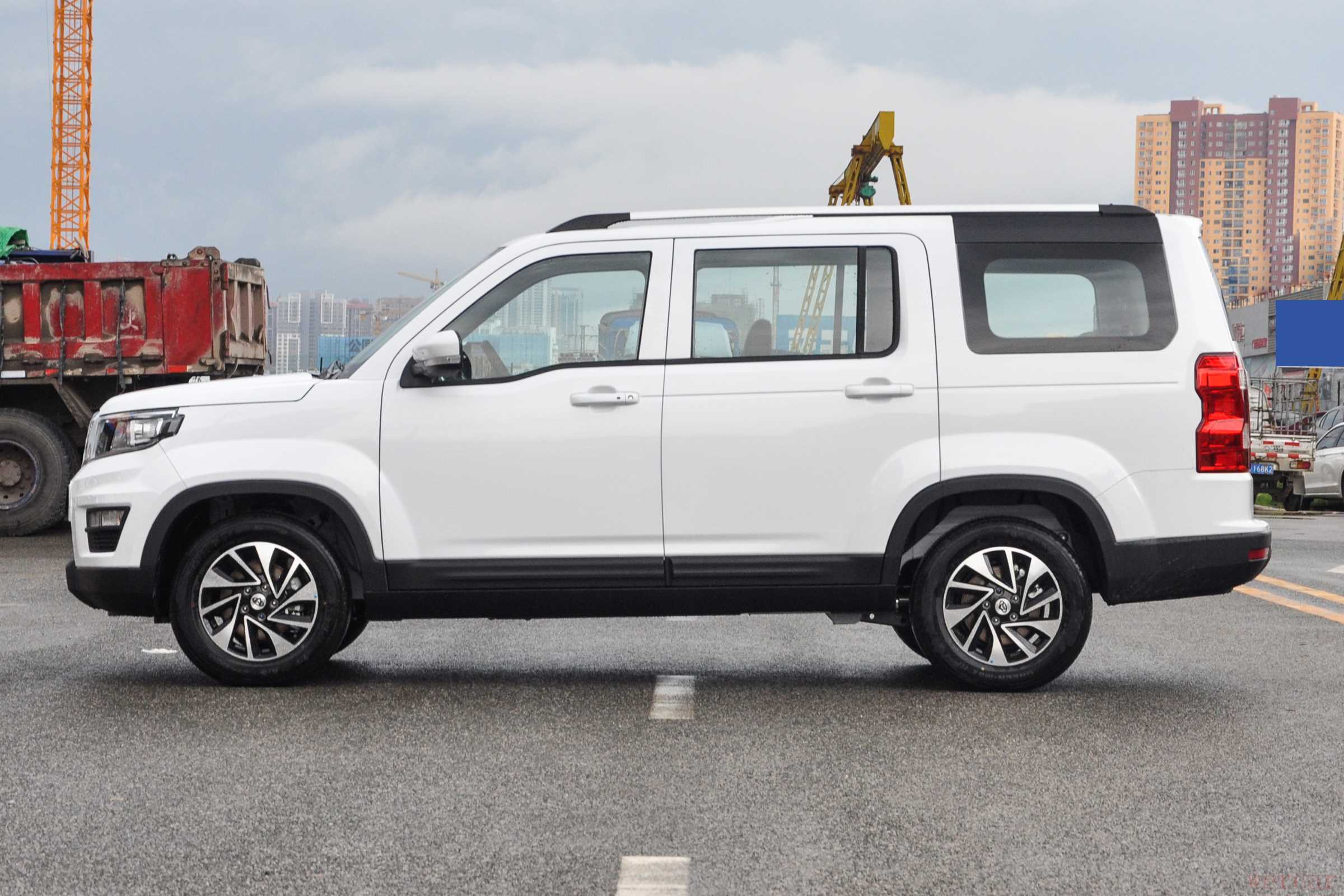 侧面整体方方正正,没有多余的装饰,干练的线条与路虎有几分相似。黑色的下包围为侧面增添了几分运动气息,不过轮胎尺寸偏小,16英寸的轮毂在这个1770mm的车身高度上给人一种小鸟依人的感觉。不过平整的设计也是为车内空间打下了基础。