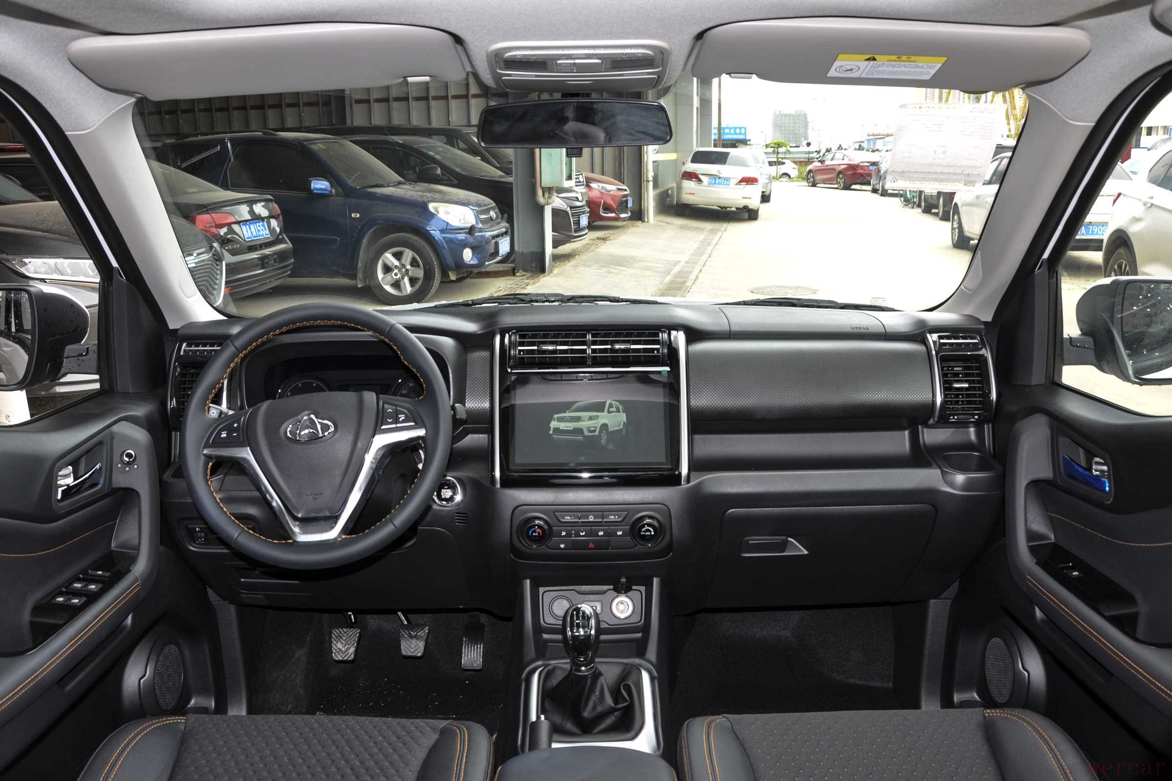 进入车内,基于这个价位,它的内饰还是在我的预料之内的:整体呈塑料质感,没有什么亮点,但是整体看起来比较硬朗,线条都是直来直往,与外观相呼应。常见的方向盘设计,真皮包裹,手感不错,转向时没有不合手的感觉。虽然价格不贵,但是还设置有一个10英寸的中控彩色屏幕,配备GPS导航系统。仪表盘是比较常见的两圆筒式设计,比较常规。配置上还有胎压报警装置,前后雷达,倒车影像;尤其是天窗的设计,在这个价位上还是有不小竞争力的。内部的空间设计很好,尤其是空调出风口设置了两个杯架,夏天吹凉,冬天保暖,实用性很强,算是这个内饰中的一大亮点;扶手台处和前方的杯架空间也都很大。座椅采用仿皮材质,中间缝线处采用红色丝线,增添了一丝生动的气息。