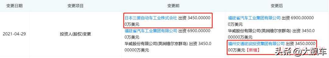 原先持股25%的股东,日本三菱自动汽车工业株式会社退出,25%的股份由新股东福州交通建设投资集团有限公司接棒,其余股东持股比例不变。