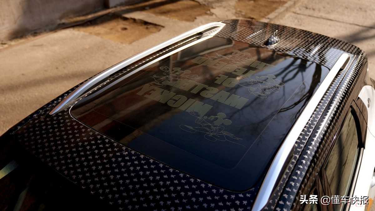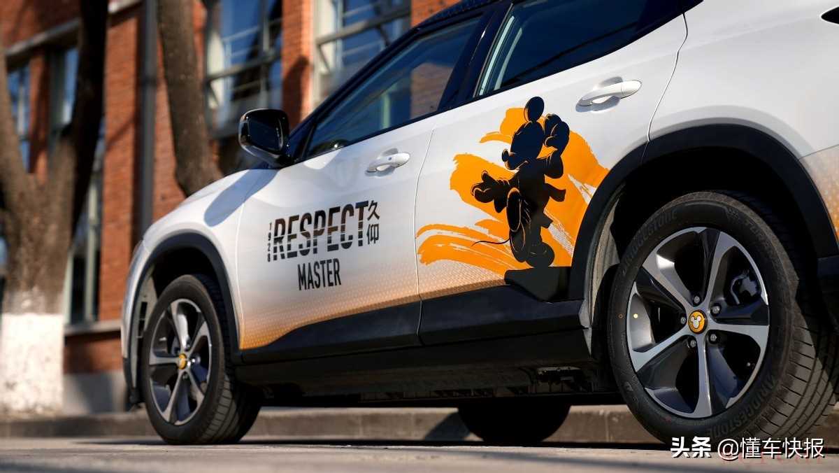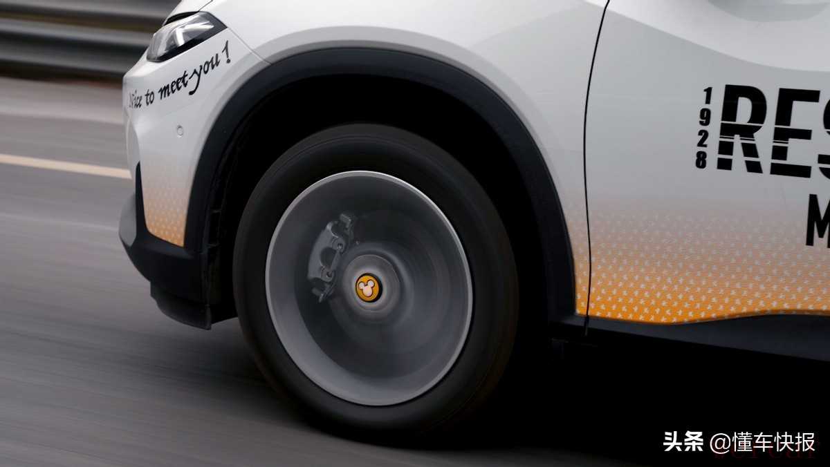本次试驾的2022款畅巡为米奇功夫版,顾名思义,这款车在车身上融入了许多米奇的IP元素,包括前大灯下沿、车侧以及车顶的大面积拉花,还有特殊样式的轮毂盖和C柱上的米奇标识等等。