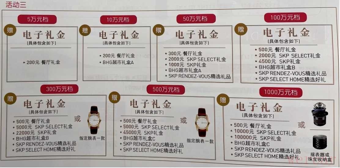 而在商场的广播里,播报的活动内容是:满千元送五十、满十万送五千电子礼金!这意味着想要加入这场购物狂欢,入场门槛是1000元,但熟悉规则的老客户们都知道,只有消费够3万元,才能感受到其中的优惠,买10万以上的珠宝腕表最划算。
