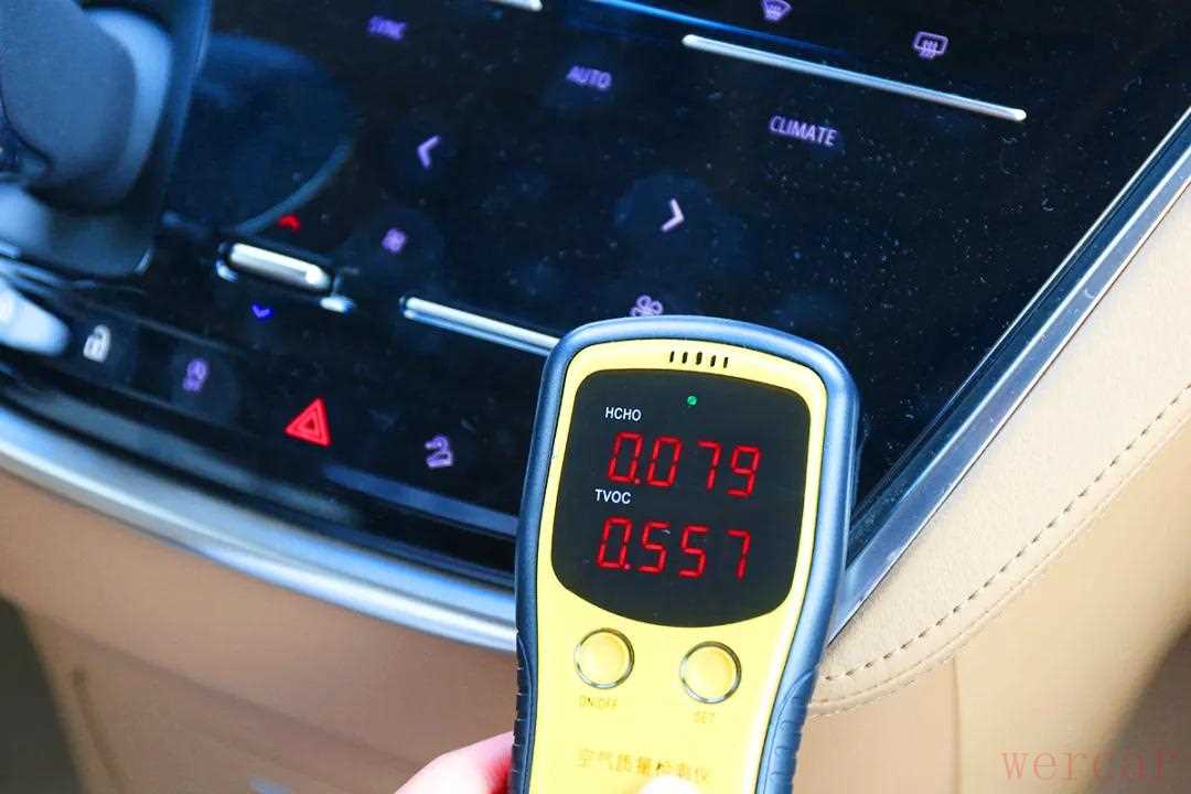接着,在车辆曝晒了4个小时之后,我们再来看空气检测仪的读数,为0.079/0.557。相比4个小时前的数据,甲醛的数值变化不算很明显,但TVOC飙升到0.557mg/m³了,不过仍然处在达标范围,指示灯仍为绿色。