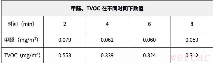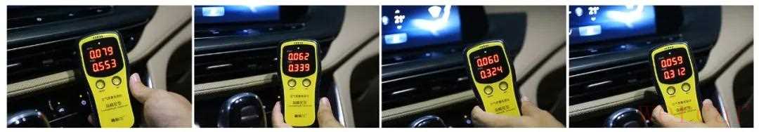 这时我们打开空调内循环,从空气检测仪读数我们看到,甲醛和TVOC的数值随着时间的推移慢慢下降到稳定的数值,相比最开始的数值还是有明显改善的。最终,经过空调调节,车内甲醛大致稳定在0.06mg/m³,TVOC大致稳定在0.32mg/m³这样的数值上下。虽然略高于4个小时前的车内数值,但是总体还是比较优秀的。