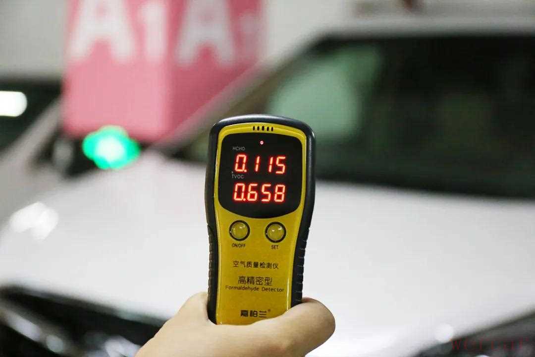 我们主要测试的是别克GL8的甲醛值和TVOC两个指标。关于我们的空气检测仪,红色指示灯表示超标,而绿色指示灯表示达标。