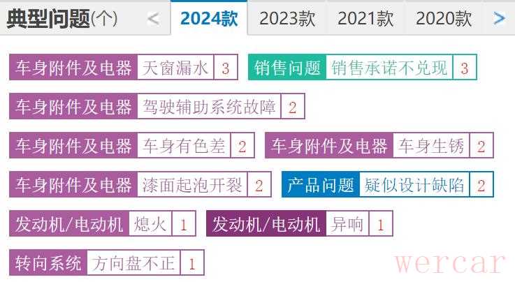 2024 年全年累计6.5万台,质量方面也较好直接挺进前五。在市场反馈中,此车的投诉主要涉及到天窗漏水、驾驶辅助系统故障、车身色差、销售承诺不兑现等。