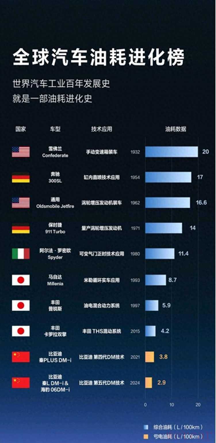 全球汽车油耗进化榜清晰地勾勒出汽车工业百年来的技术发展脉络。从1932年美国雪佛兰Confederate高达20升的综合油耗,到2024年中国比亚迪秦L DM-i的2.9升亏电油耗,油耗数据的大幅下降背后是各国车企在动力技术上的持续突破。早期美国、德国等传统汽车强国通过手动变速箱、缸内直喷、涡轮增压等技术创新推动油耗逐步降低,而日本车企则在九十年代后凭借米勒循环、油电混合动力等技术实现油耗的跨越式下降,这一历程充分体现了全球汽车产业在节能技术上的竞争与进步。