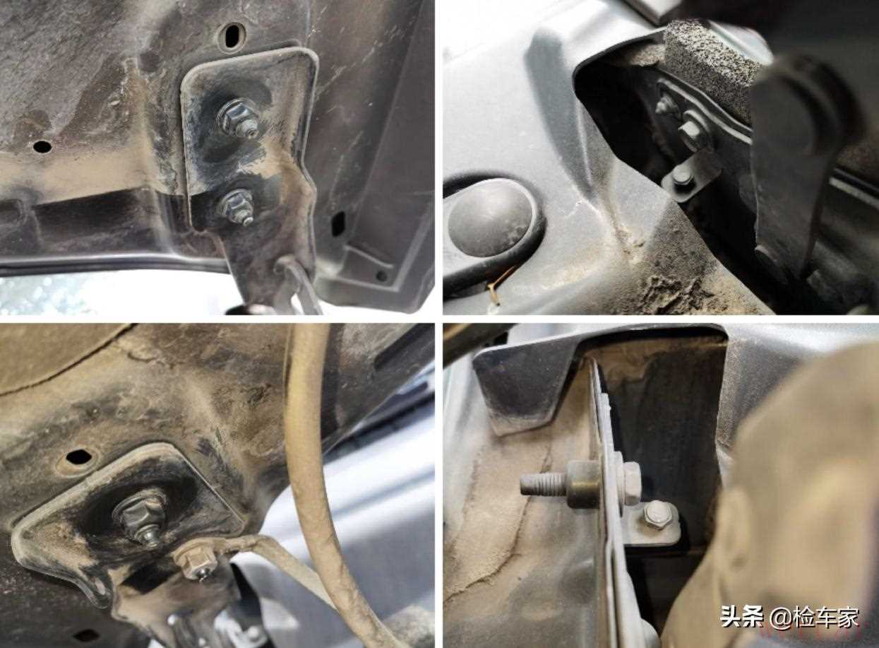 好了咱们再来看看细节:先对车辆前部进行一个事故排查,对发动机引擎盖铰链螺丝和液压撑杆螺丝检测,看有没有拧动移位迹象,从而判断有无拆修或更换。这辆车的左右铰链螺丝被泥沙覆盖住,然后小李子用抹布把它擦干净,以后发现并没有移位和拆卸的痕迹。