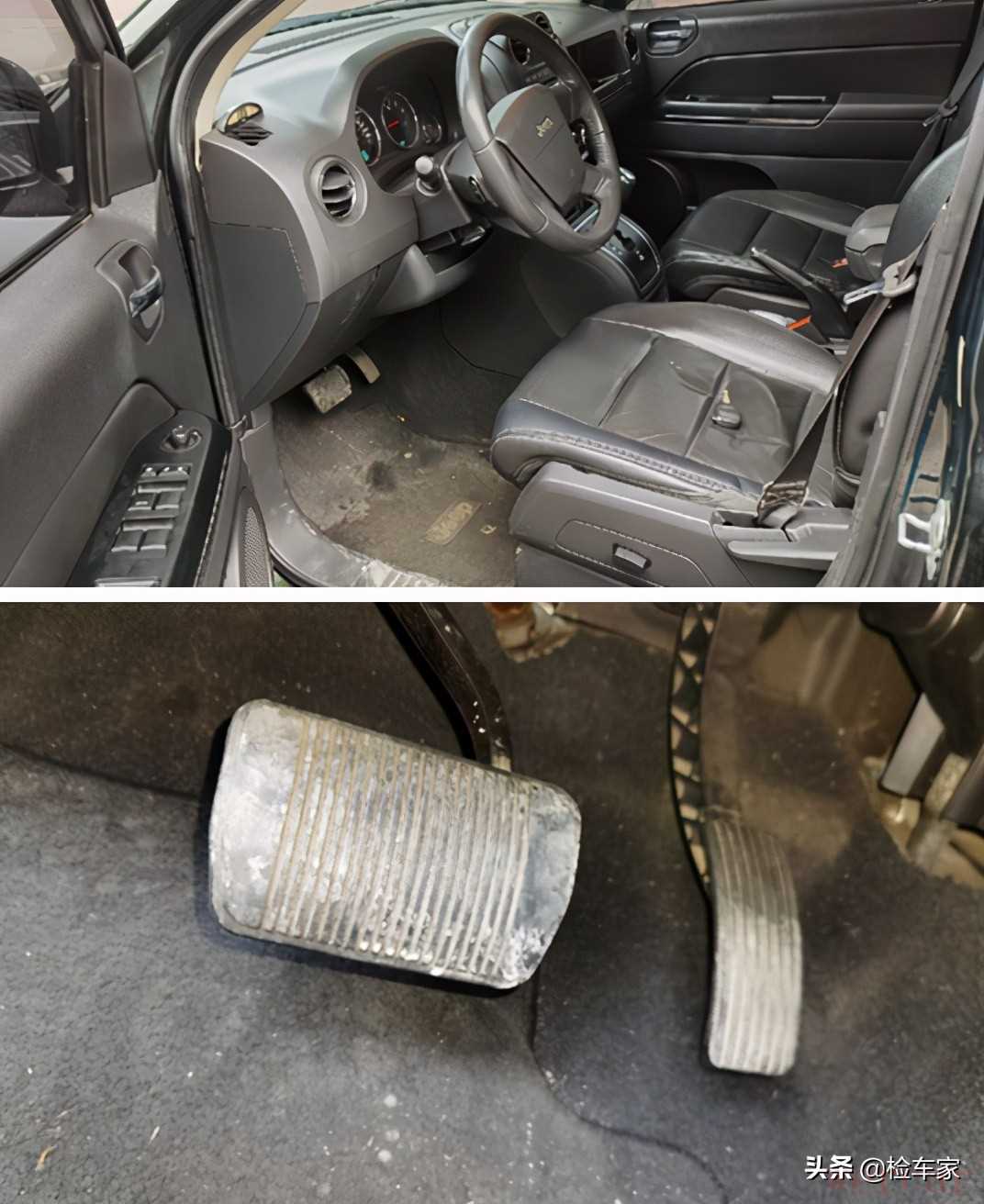 打开主驾驶车门,吉普车的内饰也没有什么好说的,依旧是塑料感十足。看那个主驾座椅的褶皱程度,很明显不像十年的车辆磨损程度,一看就是有过翻新。观察刹车脚踏板,油门脚踏板磨损程度属于也是也是比较大的,很明显就与车辆当前表现的里程公里数有差异。