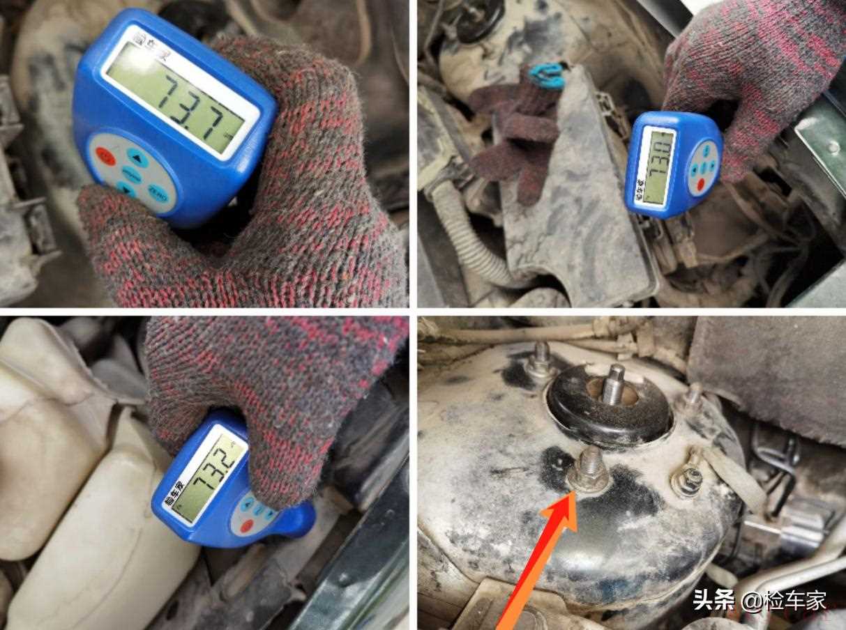 再来看两个前面的两个悬挂塔顶及翼子板边梁,发现两边的减震螺丝都有拆卸,其实看到这个也不用大惊小怪,因为减震漏油就会拆下来更换或者维修,接着又对周围一圈测了漆面数值,都是属于正常的,说明两个塔顶没有受伤,而翼子板边梁也没有变形修复的痕迹。