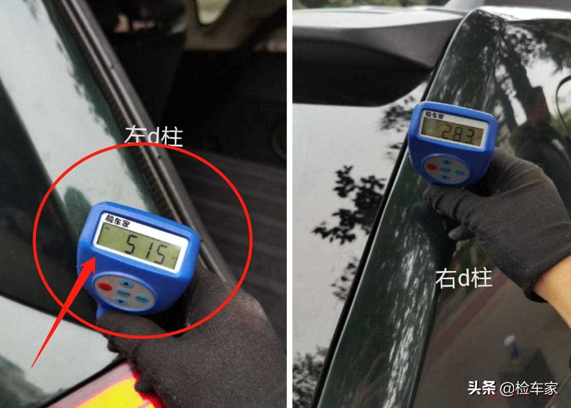 不过这是一辆SUV,所以这个车有D柱,不过检测到这个车的左D柱下部与左后翼子板结合处发现有明显的钣金喷漆修复,这就比较尴尬了,如果按照国标GBT30323-2013二手车评估鉴定技术规范,车辆ABC柱如果有钣金修复的话就属于事故车了,但是又不怎么影响行驶安全,不过会影响这个车辆的一个整体价值。等检测完再把这些情况都给客户一一说明,至于接不接受那就是客户自己的事情了。
