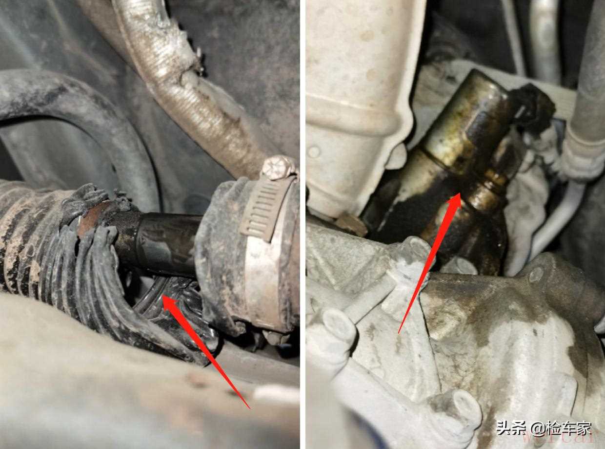 再往上面观察,发现方向机的球笼已经破损,还有发动机上面的传感器有轻微的渗油,不过这两项维修起来也不是特别麻烦,但是像方向机球笼那种,一定要去及时的处理,因为这个里面如果进了泥沙,就容易把里面的油封弄坏,导致更严重的问题。