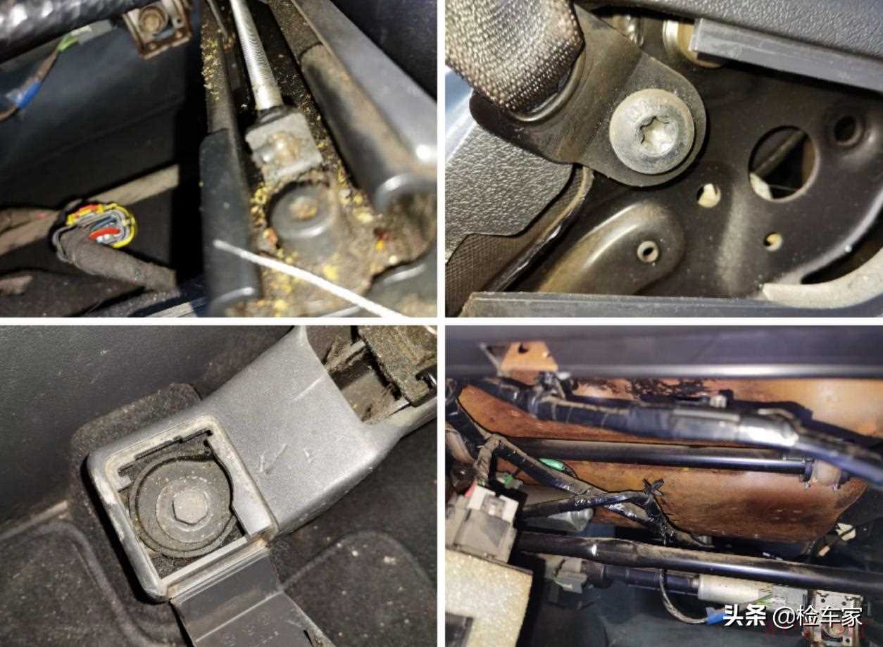 接着再对车辆是否存在水泡和火烧进行排查,检查座椅海绵和线束插头是否有变色和泥沙,方向管柱裸露部位的金属是否有锈迹,仪表台内部骨架是否有锈迹、烟熏、拆卸痕迹。很明显,座椅下部有部分锈迹,不过这个锈迹属于正常生锈,和水泡后的锈迹完全不一样,再看方向管柱上边也是比较干爽的,没有明显锈迹和打磨痕迹,这就可以说明这辆车没有被水泡过。