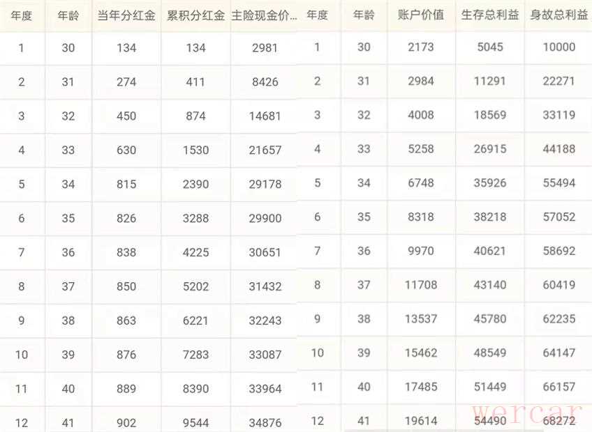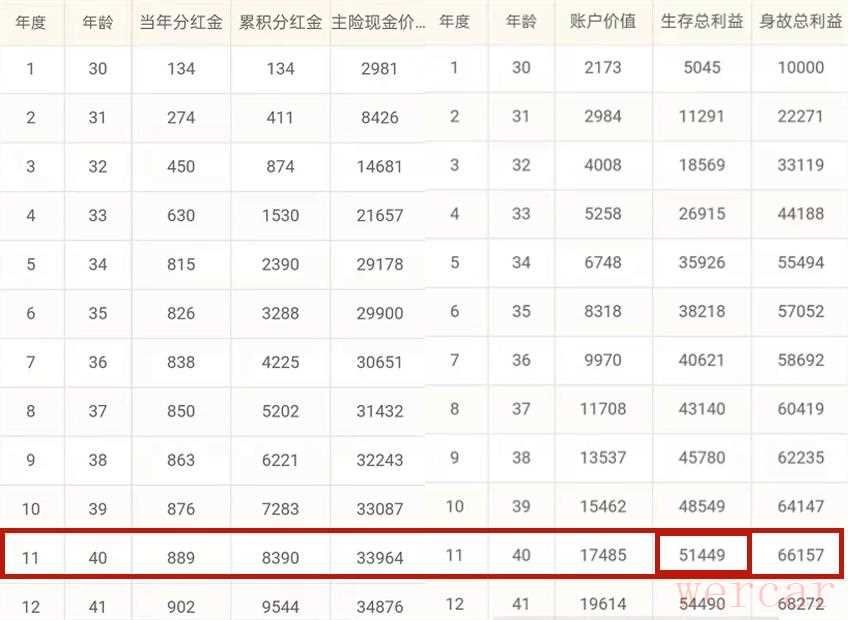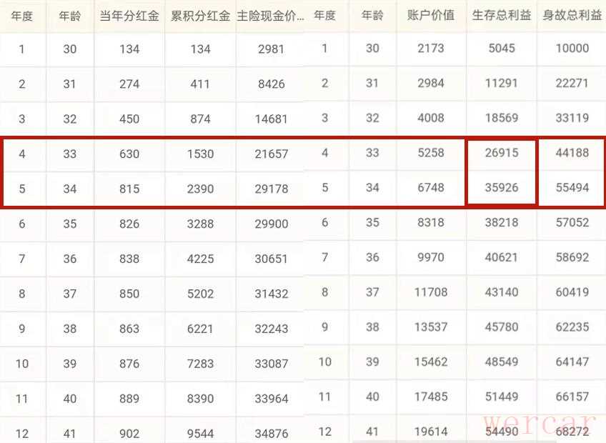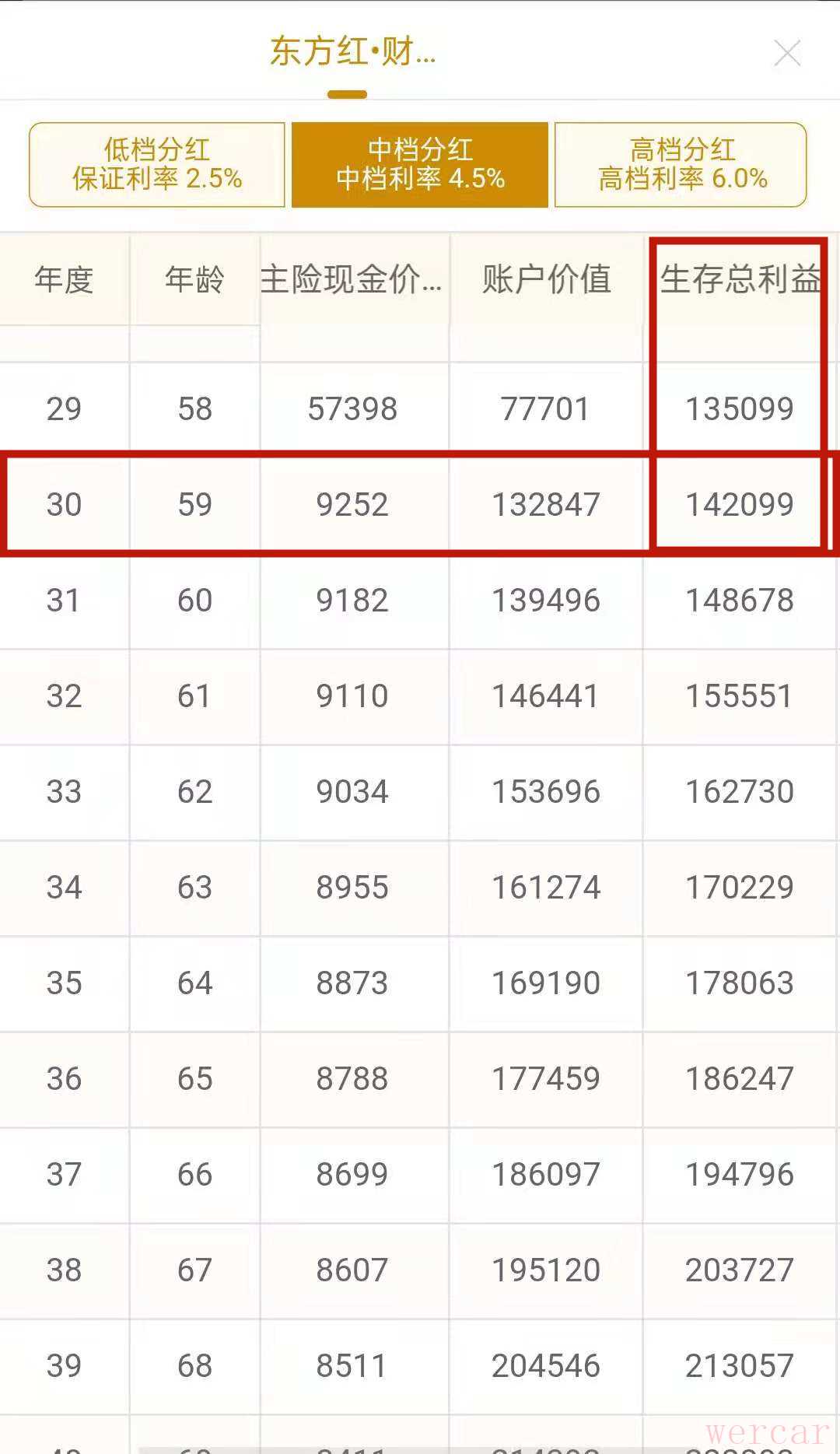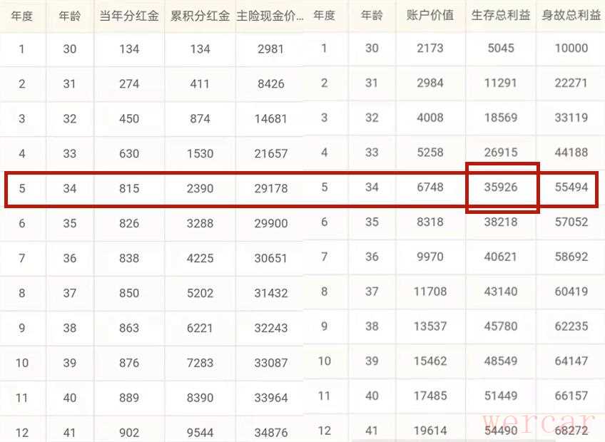 从这个表中看到,30年末生存总利益为14万2099元,5万本金分5年存入保险公司30年,获利9万2099元;相当于5万本金一次性存银行30年,平均年化收益率为6%的水平。