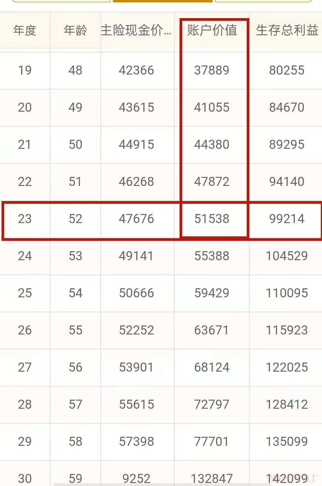 第二,我们什么时候能拿出这5万本金来用,那就要看万能账户什么时候能达到5万本金,经过推算是在保单第23年度末,万能账户金额为5万1538元,说明这时候取出相当于保险公司返还了你的本金,之后这款保险在重新凭借每年的固定返还进入万能账户重新计息,30年到期在额外给5万。