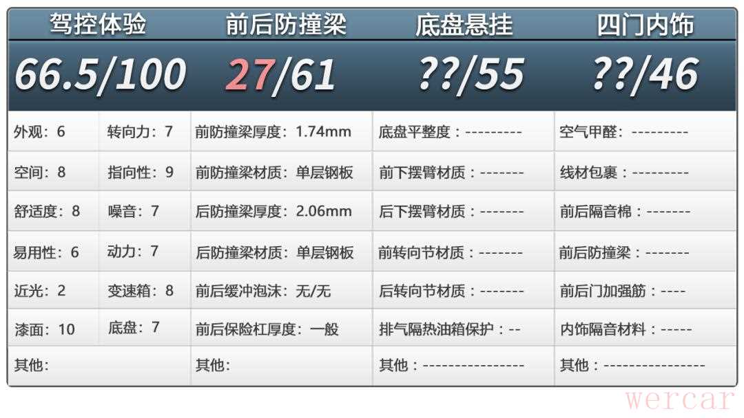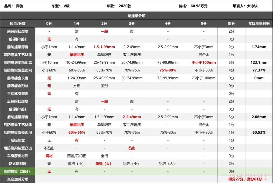 怎么跟大众似的? 相比我们拆过的这么多奔驰车来说,这辆奔驰V级的防撞梁实在令人大跌眼镜。前后防撞梁都使用钢材,没有半点儿铝合金,前防撞梁还没有独立的吸能盒,甚至连行人保护泡沫都没有,看着就跟大众一样,甚至还不如现在的大众。这是可花了六七十万买的奔驰啊,这种心理落差,简直就是“断崖”。 那么关于这辆车底盘的情况如何呢?还是请各位继续关注我们后续的拆车内容吧。(本文及视频中的测量数据结论观点仅对此辆车负责,测量数据对公示的实验方法负责。)