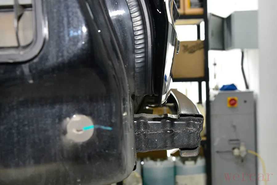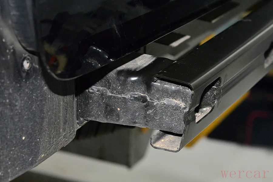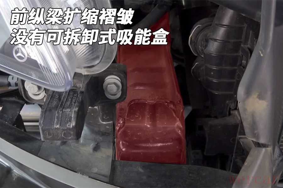 前纵梁与防撞梁之间没有可拆卸吸能盒,只是在纵梁前端设计了溃缩褶皱。这种设计哪怕是发生低速碰撞,都很容易让纵梁变形,就需要切割焊接修复,不仅对二手价格有很大影响,而且还降低了修复后的安全系数。