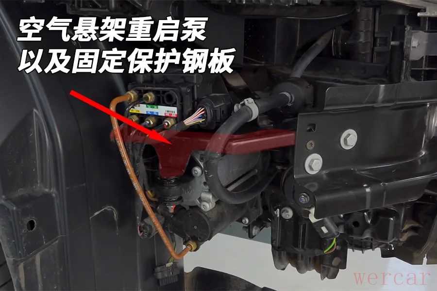 车头副驾驶一侧安装了空气悬架的气泵,这个位置比较容易受到撞击,如果充气泵或气管损坏,会导致车辆无法行驶。