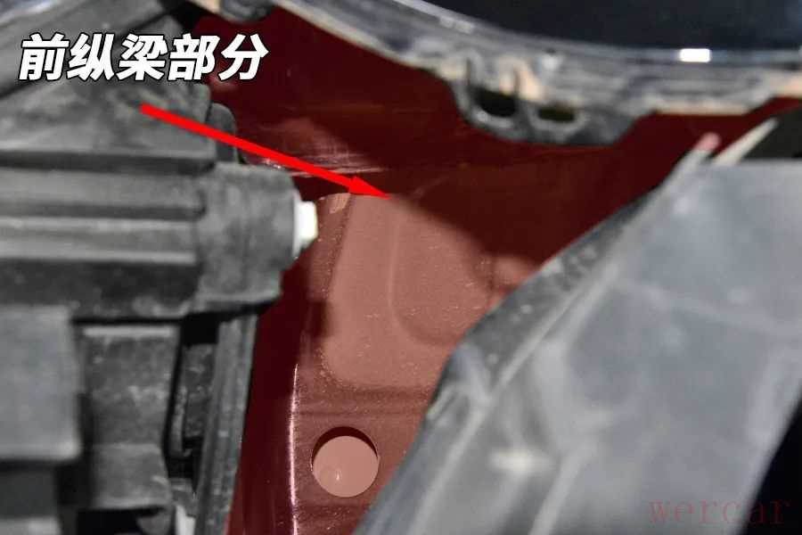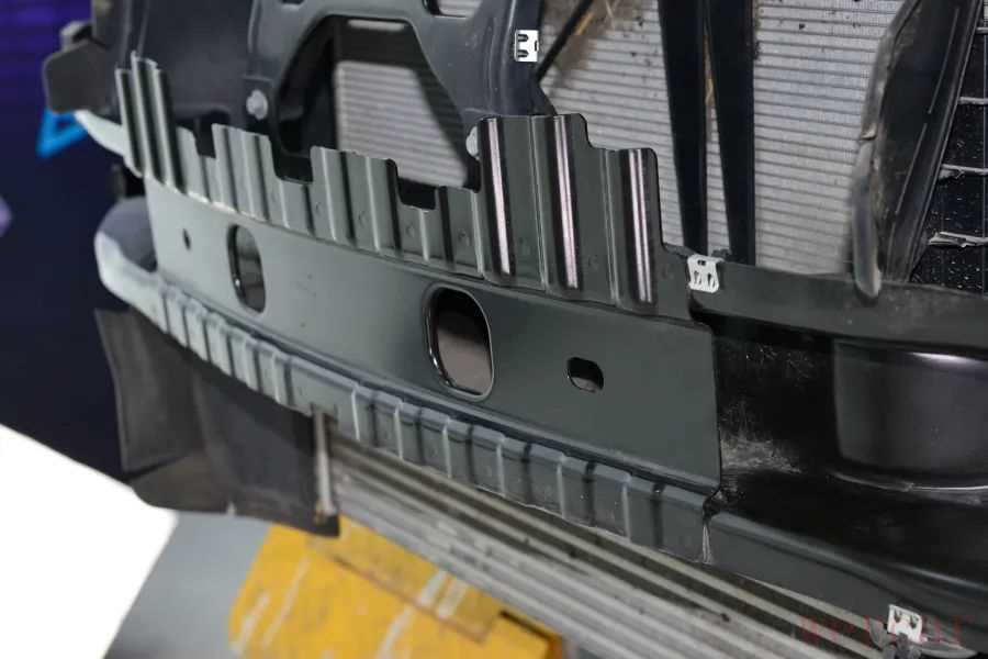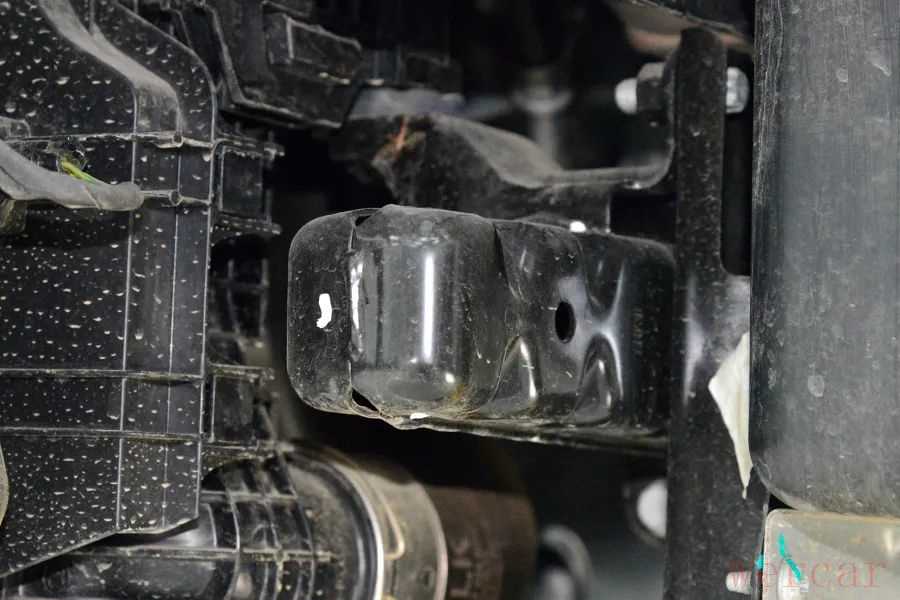 前防撞梁下方增加了应对40%碰撞测试的吸能盒,在实际碰撞中几乎不起什么作用。