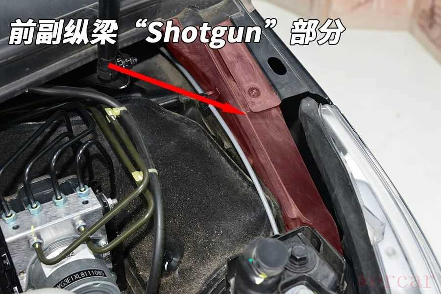 这辆车的前防撞梁非常宽,能覆盖到25%碰撞测试的范围,副纵梁“Shotgun”比较短小,很明显不是新的设计。