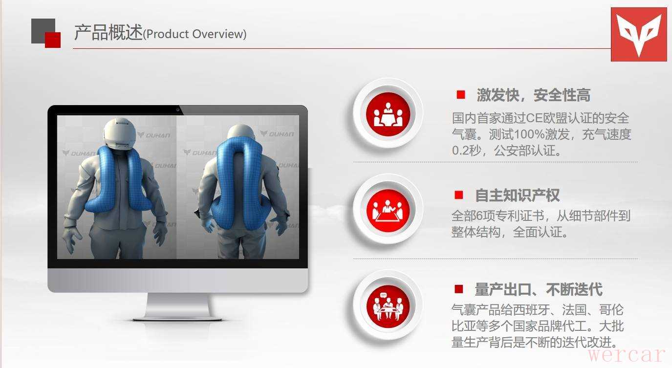 1、安全气囊:杜汉安全气囊服打破了国外的技术垄断,是国内首家通过CE欧盟认证的安全气囊。测试100%激发,充气速度0.2秒。国内则是通过了公安部的检测认证书。