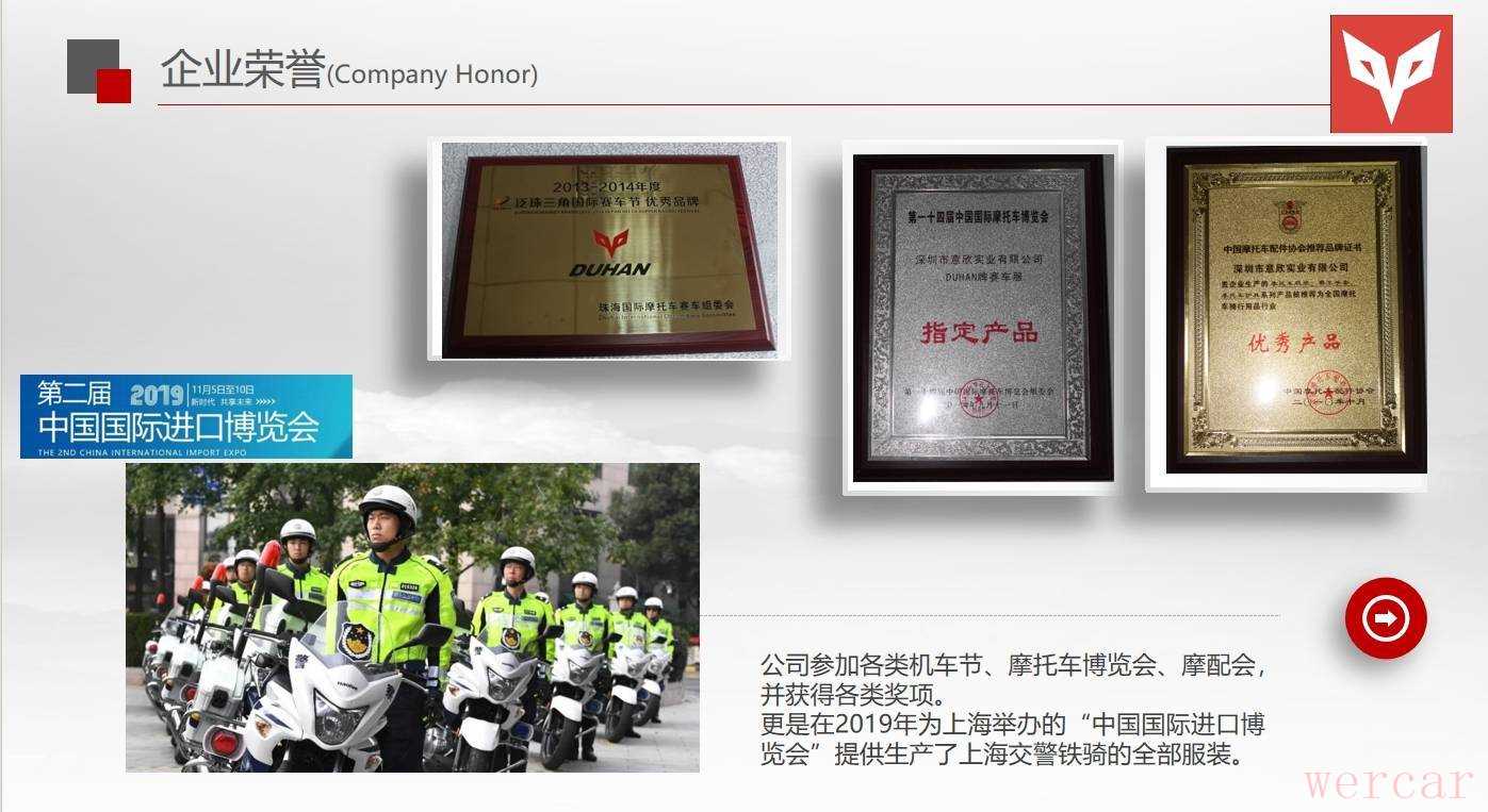 同时,DUHAN品牌已经在美国、智力、日本、加拿大等国注册并形成销售网络,加拿大海外仓今年开张营运。本公司设计开发的警用气囊骑行马甲获得公安部检测证书,并逐渐配备各市交警队,2019年上海进口博览会交警铁骑服装由本公司提供生产。