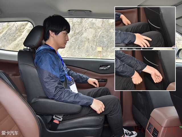第二排头部空间没有问题,而且座椅支持前后调节,调至最前面时,刚好顶到腿部,而调至最后时,有超过2拳的距离。