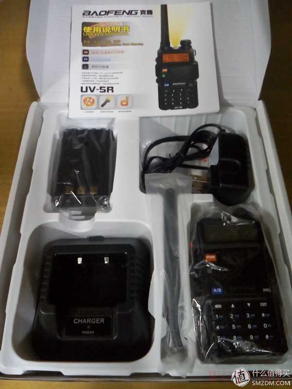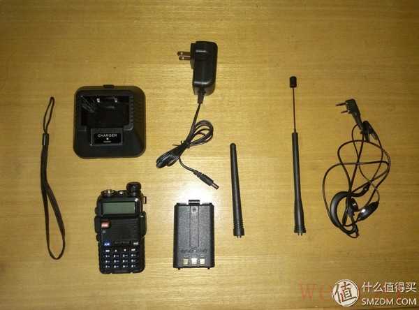 打开盒子后是这个样子。除了说明书,左上是电池,右上是充电器的电源和腕带(看不到),左下充电座,中下天线,右下对讲机本体。卖家送的附件已经拿了出来。