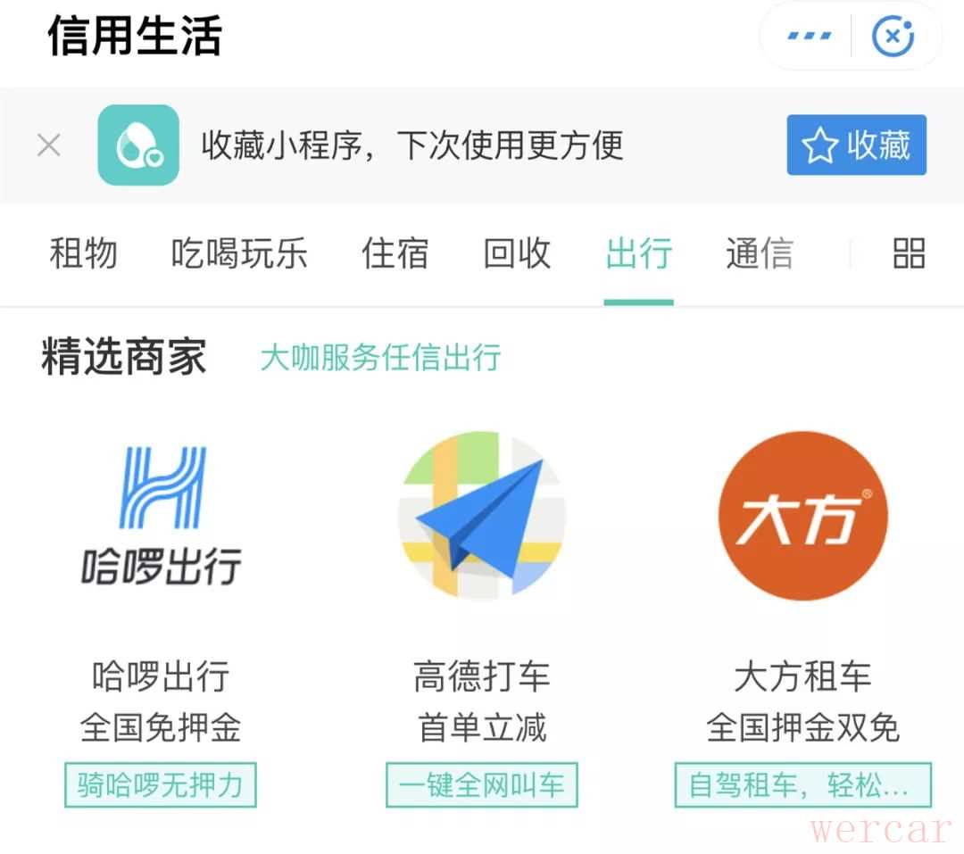 在这次申请免押租车服务失败后,记者又转战支付宝。在支付宝的“信用生活”中有“出行”一栏,点开后里面会出现多家租车企业的小程序。记者尝试了大方租车、一嗨租车的小程序,也都没有申请到免押资格。