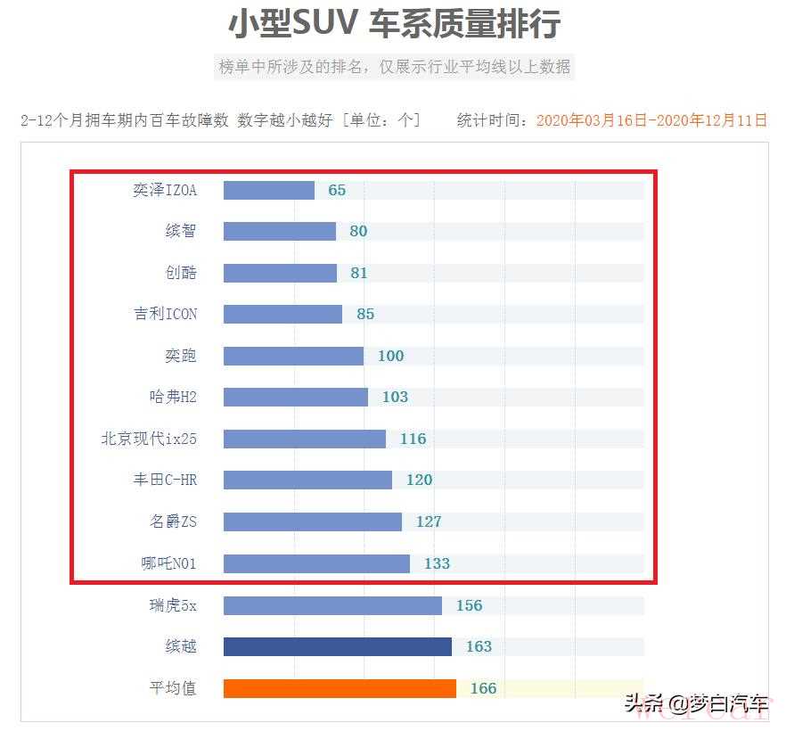 而在2020年小型SUV质量榜单位居4-10位的车型还有,吉利ICON、起亚奕跑、哈弗H2、现代ix25、丰田C-HR、名爵ZS以及哪吒NO1,其中吉利ICON和哪吒NO1都是新推出的国产SUV,其质量口碑都很不错,但目前它们的市场表现并不太好。起亚奕跑、现代ix25都是比较知名的韩系SUV,其质量表现入榜前十,也是比较令人满意的。另外,国产SUV上榜的车型还有哈弗H2和名爵ZS,哈弗H2的百车故障数只有103个,也是非常的可靠,而名爵ZS也是入榜前十,而且名爵ZS的销量表现非常不错。