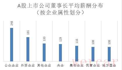 民营企业和地方国企的上市公司董事长平均年薪最低,均为108万元;其次为集体企业,董事长平均年薪116万元;央企上市公司的董事长们平均年薪129万元;其他企业(实控人为大学、其他、职工持股会、工会等)董事长平均薪酬133万元;外资企业董事长平均薪酬181万元。
