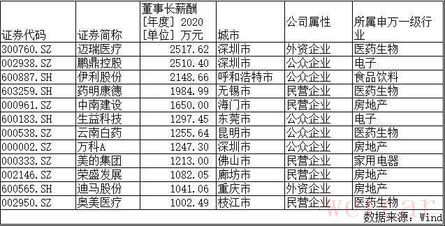 年薪超千万的董事长达到12位,其中,位于薪酬排行榜前三位的分别为李西廷,税前报酬2517.62万元;鹏鼎控股(002938.SZ)董事长兼首席执行官沈庆芳,税前报酬2510.40万元;伊利股份(600887.SH)董事长兼总裁潘刚,税前报酬2148.66万元。上述 3位高薪董事长,有2位是来自于深圳的上市公司,对于年薪超过2000万的他们来说,日均薪资5.5万起,一年就可以在深圳轻松拿下两套房。