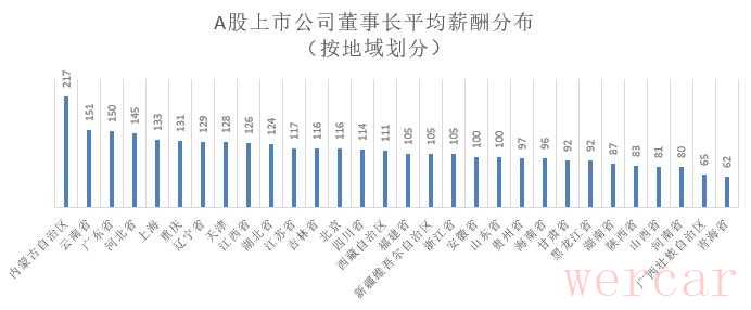 从地域来看,内蒙古和云南的董事长平均薪酬最高,原因在于此两地上市公司较少,而龙头企业伊利股份、云南白药凭借一己之力拉高了所在区域的董事长们的平均薪酬,广东老板们的薪酬则普遍较高,不愧为“老板们的故乡”。