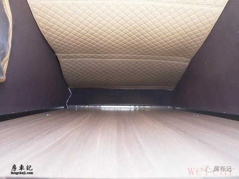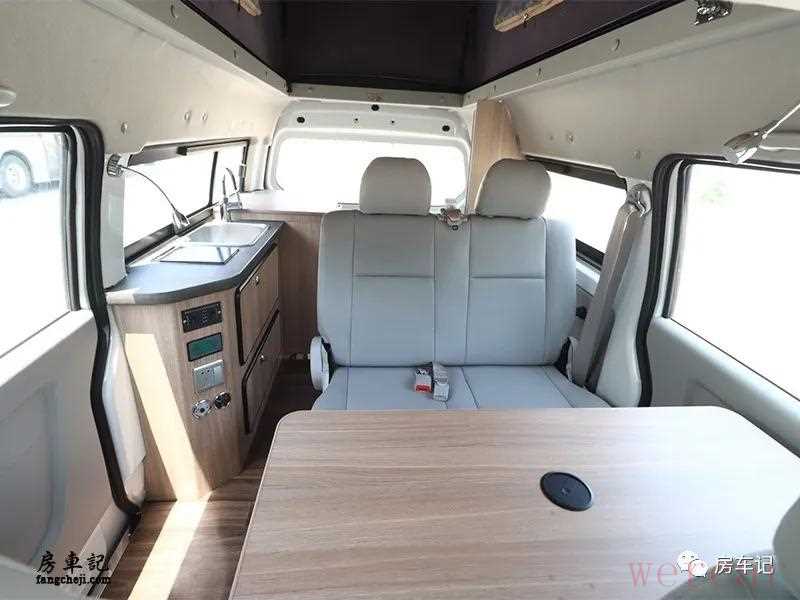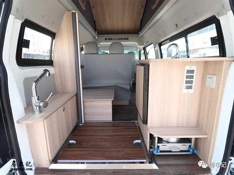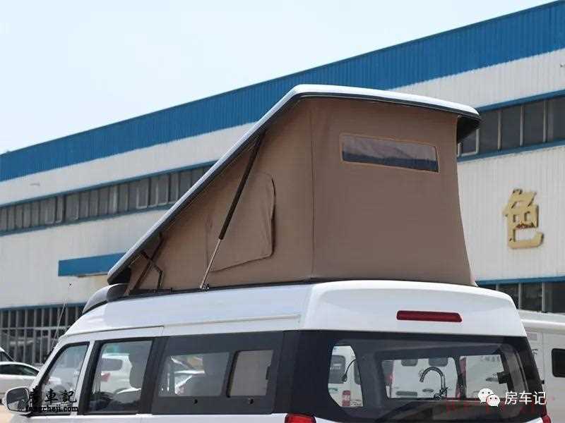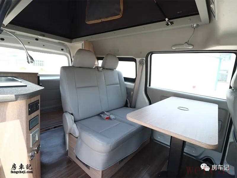 车厢两侧都配了侧滑门,两侧都可以进入车内,虽然整车尺寸确实不宽裕,但厂家别出心裁地采用了升顶设计,打开升顶车内不仅增加了一张床铺还提高了车内高度。整体打开车高2.6m,另外这辆车还可以轻松下地库,限高方面不受限制。