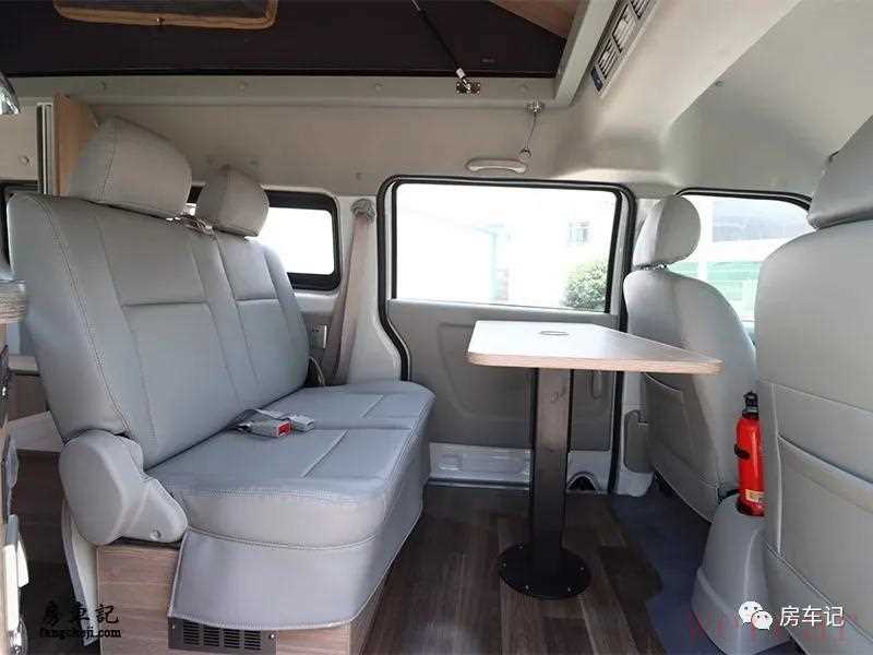 会客区是单边双人卡座加升降式小桌板,都是标准乘用车座椅,舒适性相当不错,另外配有安全带,安全驾驶方面考虑周全。这排座椅放倒后可以秒变一张单人床铺,这个床铺的尺寸是:800*1850mm,休息一个成年人完全没有问题,如果是较苗条的夫妻俩挤挤也能睡得下。