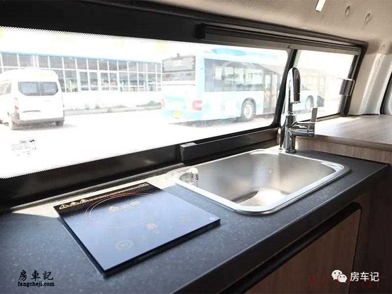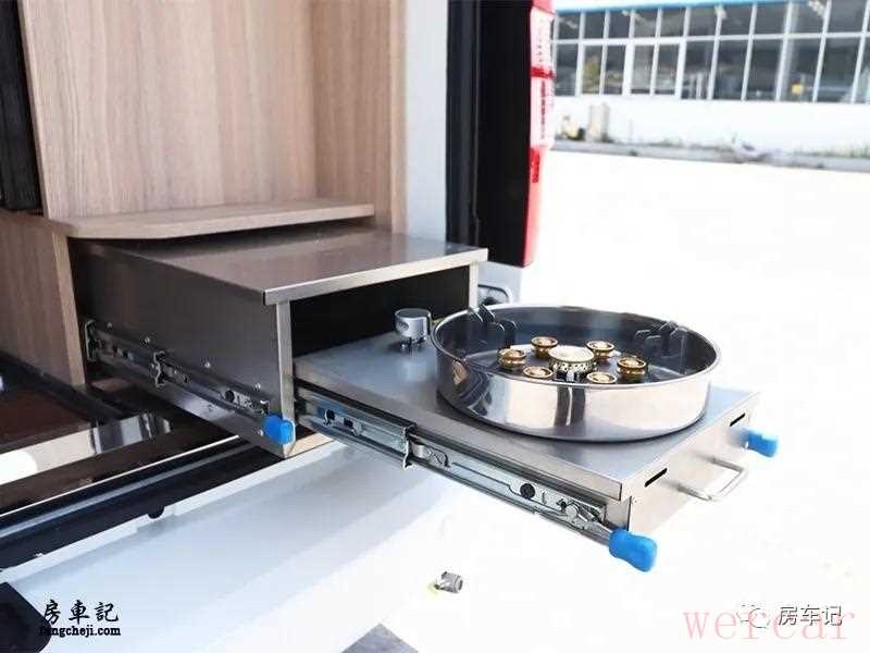 打开尾门后第一眼可以看到厨房区域,厨房配有电磁炉和洗菜池,下方带一个较大的储藏区域。带外置厨房,配备有一台车载冰箱,下方的燃气炉可以拉出来做餐食,还可以避免车内油烟浓重。