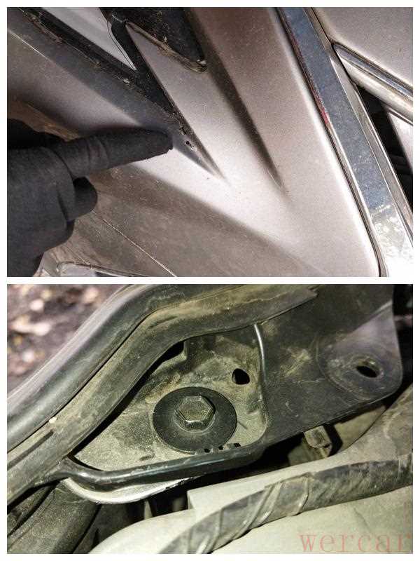 前面保险杠整个喷漆,各个缝隙边缘都有毛刺儿和漆雾,再看固定螺丝是拆过的,那么前杠大概率换过了!换前杠意味着车头有碰撞,我们就要小心里面有没有大的损伤。