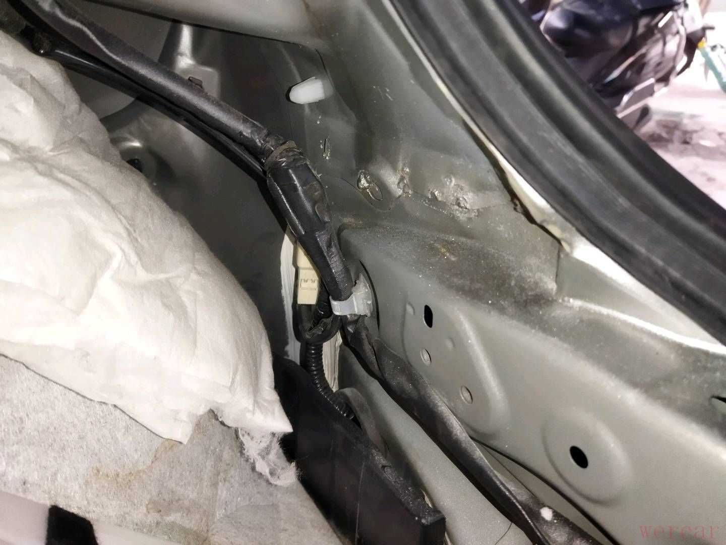看看里边,这后备箱的左边边框都变形了,没有进行维修处理,可能师傅觉得不影响使用吧!再往里,铁材质的左后叶子板内衬生锈了?怎么回事,仔细一看,原来是焊接了,不过焊接的面积不大,说明变形不严重。