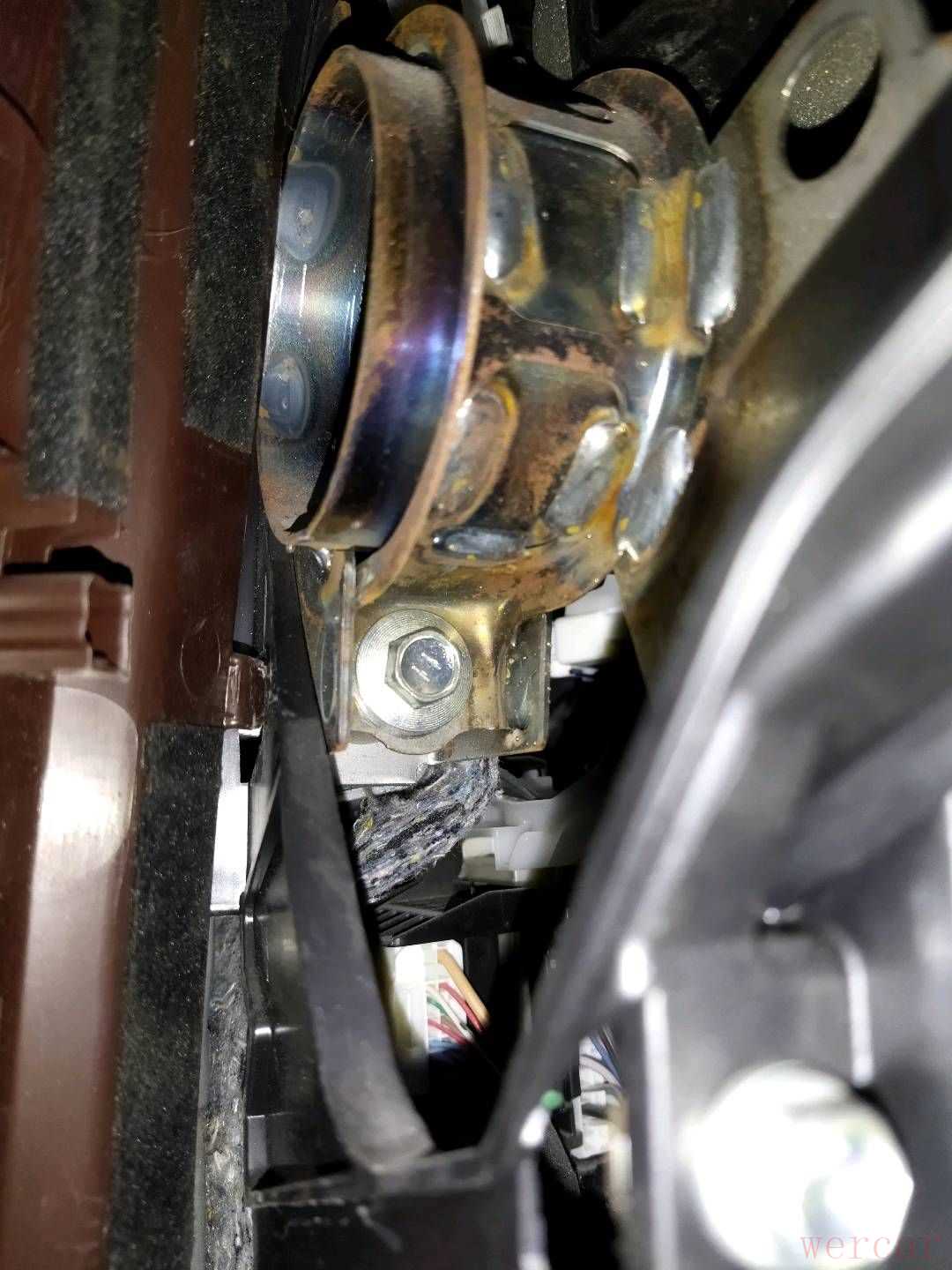 接着看了一下防撞梁的螺丝,原封未动,还是原厂模样。上面的水箱框架、水箱也都没问题,这些部件都是前面事故的主要受力点,它们是好的,说明前面的碰撞并不大。