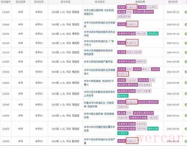 从今年年初截至至今年3月12日,出现过机油乳化问题的车主竟然占据了投诉榜的6-7成!(下图为华晨中华车型的投诉列表,最新时间截至在今年3月12日,标红处为投诉最多的“机油乳化”问题)